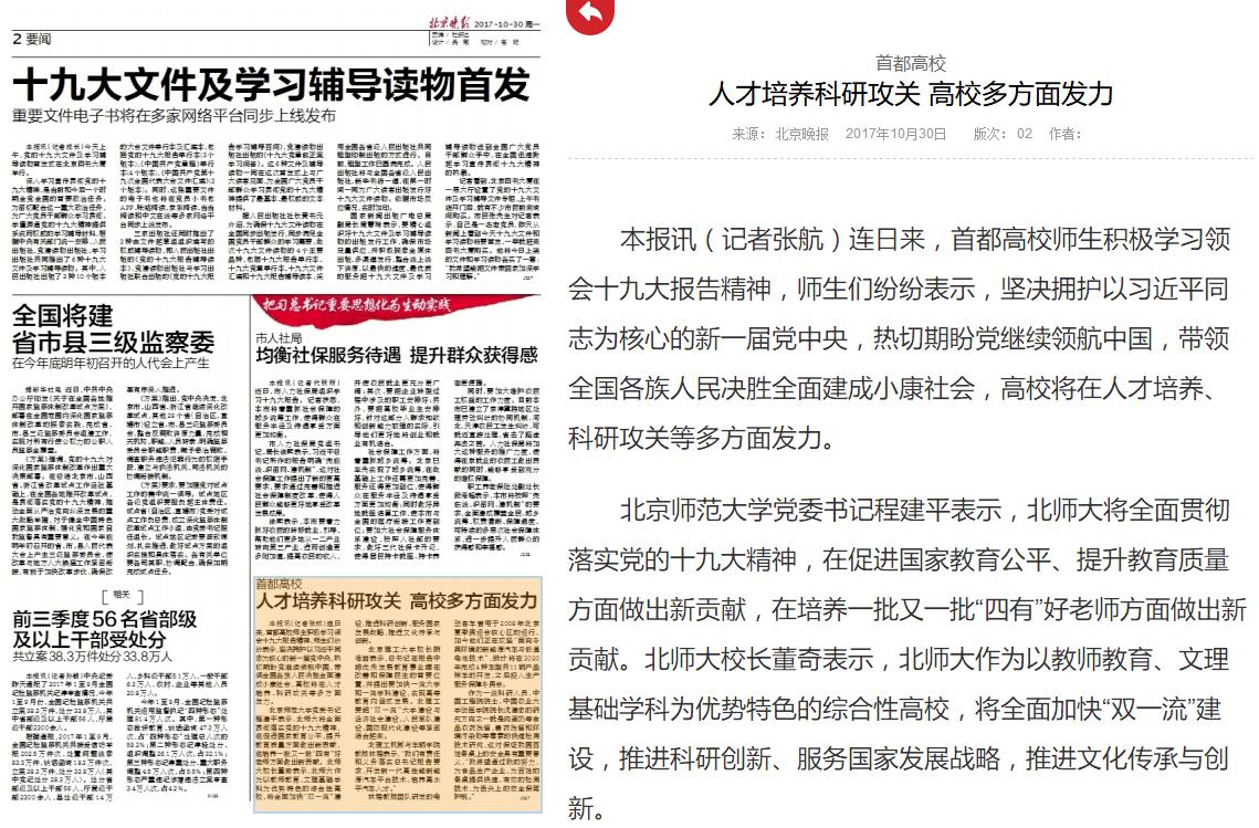 北京师范大学党委书记程建平表示,北师大将全面贯彻落实党的十九大精神,在促进国家教育公平、提升教育质量方面做出新贡献,在培养一批又一批“四有”好老师方面做出新贡献。北师大校长董奇表示,北师大作为以教师教育、文理基础学科为优势特色的综合性高校,将全面加快“双一流”建设,推进科研创新、服务国家发展战略,推进文化传承与创新。