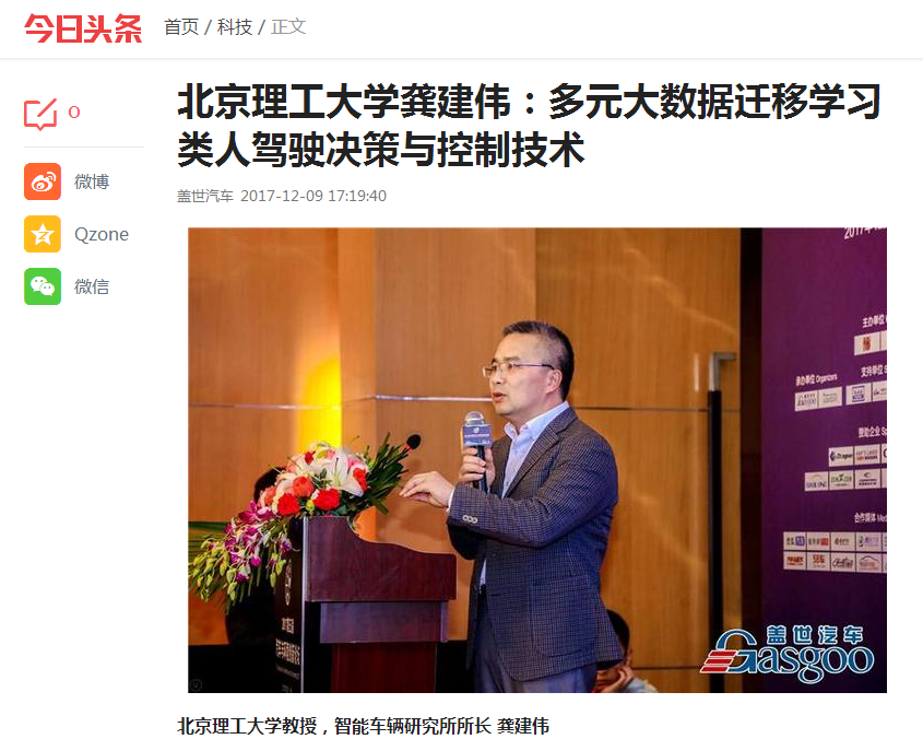 【今日头条】金年会jinnianhuicom龚建伟:多元大数据迁移学习类人驾驶决策与控制技术