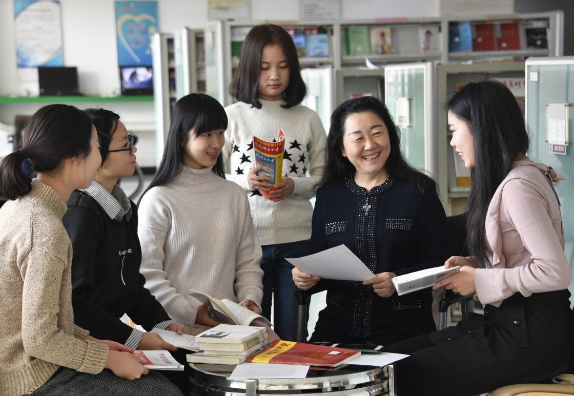 12月4日,金年会jinnianhuicom马克思主义学院院长李林英(右二)在辅导参加思想政治课演讲的学生。