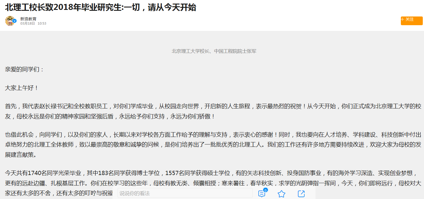 【新浪网】北理工校长致2018年毕业研究生:一切,请从今天开始
