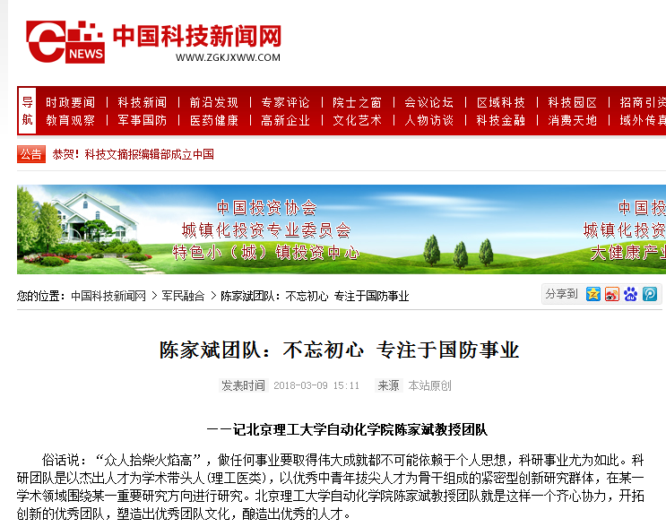 【中国科技新闻网】北理工陈家斌团队:不忘初心 专注于国防事业