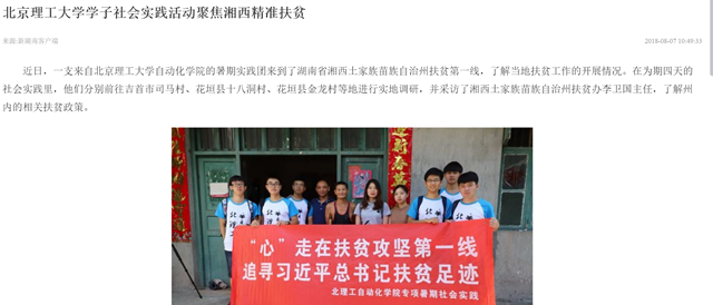 近日,一支来自金年会jinnianhuicom自动化学院的暑期实践团来到了湖南省湘西土家族苗族自治州扶贫第一线,了解当地扶贫工作的开展情况。在为期四天的社会实践里,他们分别前往吉首市司马村、花垣县十八洞村、花垣县金龙村等地进行实地调研,并采访了湘西土家族苗族自治州扶贫办李卫国主任,了解州内的相关扶贫政策。