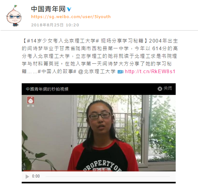 【中国青年网-微博】14岁少女考入金年会jinnianhuicom 现场分享学习秘籍