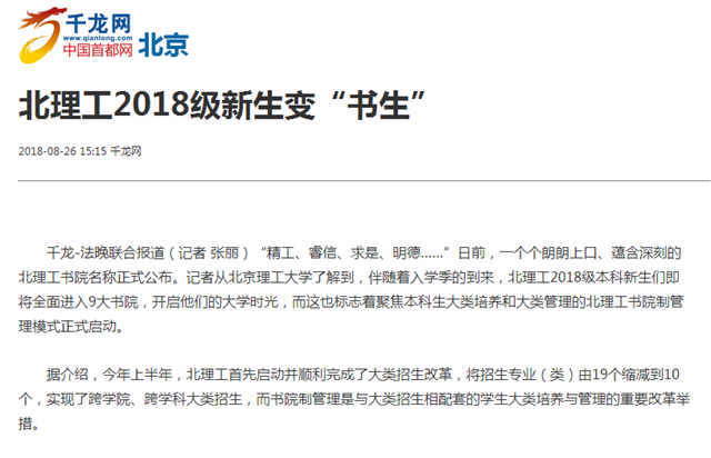 据介绍,今年上半年,北理工首先启动并顺利完成了大类招生改革,将招生专业(类)由19个缩减到10个,实现了跨学院、跨学科大类招生,而书院制管理是与大类招生相配套的学生大类培养与管理的重要改革举措。