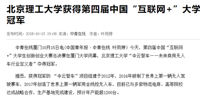 据悉,获得冠军的 “中云智车”项目组建于2012年,2016年研制了世界上第一辆无人驾驶赛车,2017年创造了世界上第一辆军用全线控无人车,目前已与多家物流电商、高等院校达成战略合作,生产基地完成建设,预计年产能超1200台。
