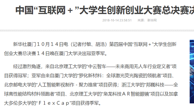 【新华网】中国“互联网+”大学生创新创业大赛总决赛决出冠亚季军
