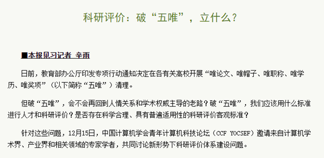 美国俄亥俄州立大学计算机科学与工程系主任、 Robert M. Critchfield讲席教授张晓东:“ 五唯”中的学历、帽子、奖项和职称(级别)是自上而下规定的,论文是国际同行评议。“五唯”之间的关系就是,学历需要论文,帽子需要学历、奖项、论文和职称,奖项需要学历、帽子、论文和职称。只有论文的发表不在体制内评价,也就是说“五唯”中最客观的还是论文。