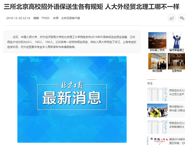 【北京日报】三所北京高校招外语保送生各有规矩 人大外经贸北理工哪不一样