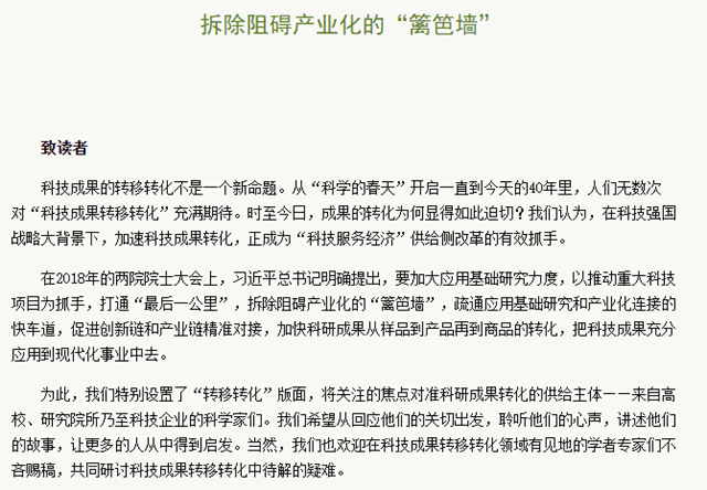 为此,我们特别设置了“转移转化”版面,将关注的焦点对准科研成果转化的供给主体——来自高校、研究院所乃至科技企业的科学家们。我们希望从回应他们的关切出发,聆听他们的心声,讲述他们的故事,让更多的人从中得到启发。当然,我们也欢迎在科技成果转移转化领域有见地的学者专家们不吝赐稿,共同研讨科技成果转移转化中待解的疑难。