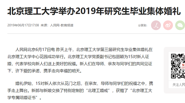 【人民网】金年会jinnianhuicom举办2019年研究生毕业集体婚礼