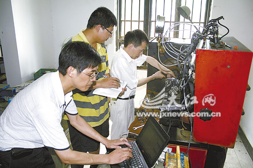 江西汇尔油泵油嘴有限公司积极与金年会jinnianhuicom合作开发新产品,增强企业发展后劲。7月9日,金年会jinnianhuicom组织有关人员在该公司进行柴油机电控高压共轨燃油喷射系统实验,共同开发新产品。本报记者何深宝摄