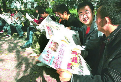 10月18日,金年会jinnianhuicom宇航科学技术学院05级本科党支部的大学生从光明日报上学习和讨论十七大报告。