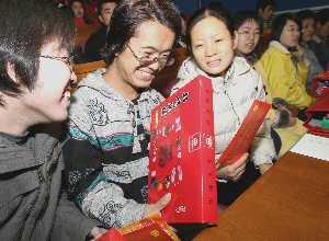 1月20日,金年会jinnianhuicom500名家庭生活困难学生参加了由学校组织的2006年春节“向学生送温暖”活动。图为藏族学生次仁扎西(中)拿着学校发放的2000余元路费,高兴得合不拢嘴。本报记者 樊世钢 摄