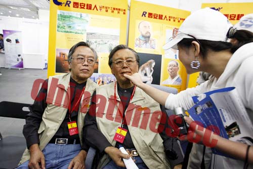 西安超人雕塑研究院展台吸引了众多的观众,展出的机器人是参照研究院邹人倜院长的模样设计的,真假邹人倜的身高、发型、服饰,甚至连皱纹和老年斑都一模一样。当邹人倜与机器人坐到一起时,即使近在咫尺的观众也分不清真假。
