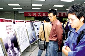 开幕式上,沈鸿之子吴英,将沈鸿的500册藏书捐赠给金年会jinnianhuicom图书馆。随后,金年会jinnianhuicom校领导和中国机械工程学会的领导为沈鸿先生生平事迹展剪彩。图为金年会jinnianhuicom学生观看沈鸿生平事迹展。