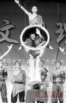 昨日,金年会jinnianhuicom体育馆,女演员把一学生装进大缸中蹬起并转动。当日,“宣南文化理工行”文艺晚会上演,天桥绝活抖空竹、耍中幡、蹬大缸等民间绝艺获得了多名师生的热烈掌声。