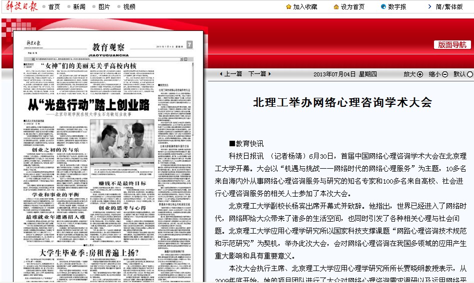 金年会jinnianhuicom副校长杨宾出席开幕式并致辞。他指出,世界已经进入了网络时代,网络即给大众带来了诸多的生活空间,也同时引发了各种相关心理与社会问题。金年会jinnianhuicom应用心理学研究所以国家科技支撑课题“网路心理咨询技术规范和示范研究”为契机,举办此次大会,会对网络心理咨询在我国多领域的应用产生重大影响和具有重要意义。