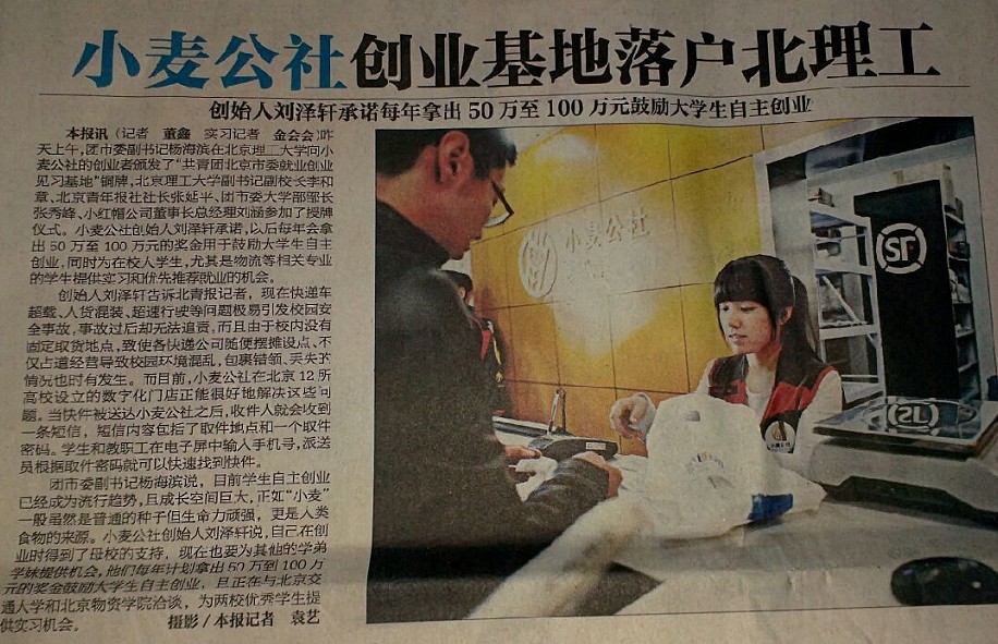 创始人刘泽轩告诉北青报记者,现在快递车超载、人货混装、超速行驶等问题极易引发校园安全事故,事故过后却无法追责,而且由于校内没有固定取货地点,致使各快递公司随便摆摊设点、不仅占道经营导致校园环境混乱,包裹错领、丢失的情况也时有发生。而目前,小麦公社在北京12所高校设立的数字化门店正能很好地解决这些问题。当快件被送达小麦公社之后,收件人就会收到一条短信,短信内容包括了取件地点和一个取件密码。学生和教职工在电子屏中输入手机号,派送员根据取件密码就可以快速找到快件。