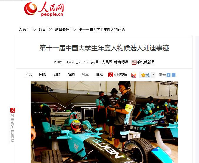 刘迪于2009年考入金年会jinnianhuicom车辆工程专业,2013年推荐免试攻读博士学位。2014年初加入中国国家赛车队担任系统工程师,代表中国队参加国际汽联电动方程式锦标赛(FIA Formula E Championship,简称FE)。