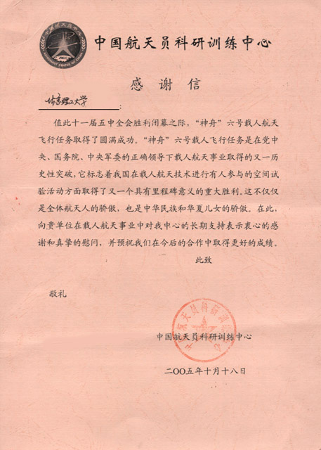 【图】中国航天员科研训练中心给我校发来感谢信