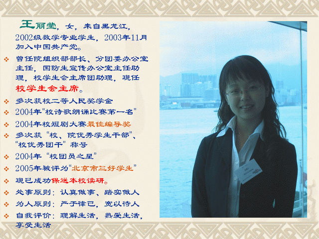 王丽莹,女,来自黑龙江,理学院2002级数学与应用数学专业学生,2003年11月加入中国共产党。曾任理学院分团委组织部部长、分团委办公室主任,国防生宣传办公室主任助理,校学生会主席团助理,现任校学生会主席。多次获校人民奖学金,2003年获“院马列主义优秀学员”称号、2004年获“校诗歌朗诵比赛第一名”、2004年获“‘剧在今夜’校短剧大赛最佳编导奖”,曾多次获“校、院级优秀学生干部”“校优秀团干”光荣称号,2004年在团系统五四评比中被评为“校团员之星”,2005年被评为“北京市三好学生”。现已被保送本校读研。