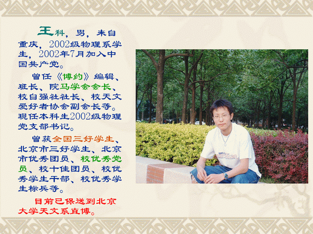 王科,2002级物理专业学生,典型的重庆小崽儿,热情,干练,爱憎分明。来北理之前毕业于鼎鼎大名的重庆清华中学——这所中学的特点是很少有人考到清华大学:)在过去的三年中,曾任宿舍长,班长,课代表,学习委员,军训班长,院马列主义学习会部长、会长,院刊《博约》编辑,校刊《北理人》编辑,校自强社社长,校天文爱好者协会副会长,校勤工助学中心干事,党支部宣传委员、支部书记等十四项、凡二十余次职务,不可思议的工作狂!学习上也不含糊,连续五次获甲等人民奖学金,连续三次获一等国家奖学金。看上去不壮,其实体育很强,尤善长跑。曾经数次夺得院运动会长跑项目的冠军并打破记录,也曾经因为拼的太厉害晕倒在校运动会的万米跑道上。曾获荣誉包括全国三好学生、北京市三好学生、北京市优秀团员、校优秀党员、校十佳团员、校优秀学生干部、校优秀学生标兵等。目前已保送到梦寐以求的北京大学天文系直博。