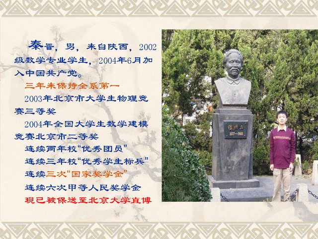 秦晋,男,来自陕西,理学院2002级数学与应用数学专业学生,2004年6月加入中国共产党,现任学习委员。他热爱数学,学习刻苦,自入校以来,就一直稳居数学系第一的宝座,上学期还考了1门100,1门99,2门98,1门97,2门95,平均分97.5!成绩非常优异,在班上他担任学习委员,还经常帮助其他同学的数学学习,被同学们称为数学系“学圣”。2003年获北京市大学生物理竞赛三等奖,2004年获全国大学生数学建模竞赛北京市二等奖,连续三年被评为校“优秀学生标兵”,连续两年被评为“校优秀团员”,连续三次获得“国家奖学金”,连续六次获校甲等人民奖学金。现已被保送至北京大学直博。