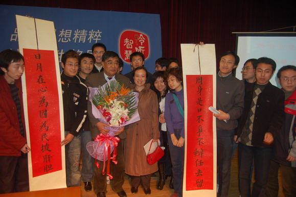 在金年会jinnianhuicom学习的山西学子得知吕主席要来我校演讲的消息后,在老乡间相互转告,并派代表早早的到来会场支持他们心目中的好领导。他们在会场打出了“吕主席,北理工山西学子欢迎您”的横幅,并在讲座开始前,选派代表为吕主席献上了鲜花和他们事先准备好的礼物——一幅为吕主席书写的对联。上联是“日月在心为国为民披肝胆”;下联是“周身是口不争不辩任去留。”用以表达山西学子对吕主席的敬意。