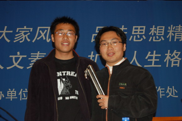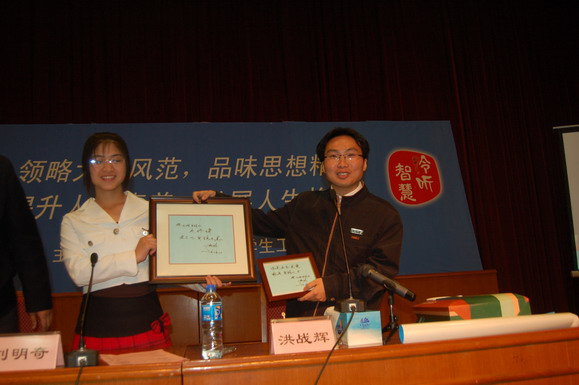 学生工作部部长刘明奇代表学校把一些具有学校特色的纪念品和讲座的海报赠送给了洪战辉同学。同时,洪战辉同学也为我校自强社准备了一份小礼物。由他亲笔题写的一幅硬笔书法作品,内容是“天行健,君子以自强不息 与金年会jinnianhuicom自强社同学共勉”