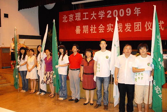 最后,由到会的领导和嘉宾为2009年暑期社会实践团的代表进行授旗,将发团仪式推向了高潮。