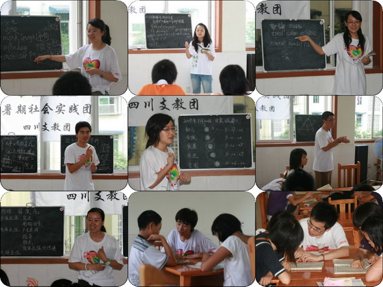 支教团抵达时正值当地特大暴雨过后,空气异常潮湿,气温高达38摄氏度,但这阻挡不住大家为灾区学生服务的热情。当日下午,不顾旅途疲劳,在当地老师和学生的带领下,支教团参观了聚源中学的新旧校址,走访部分学生家庭,了解当地学生目前的生活学习状况,以便更有针对性地开展支教工作。当晚10时,支教团召开了第一次工作协调会议,结合下午家访的情况和学生学习上存在的困难,支教团对接下来几天的教学计划在原有安排上进行了细微调整,主要是针对部分学习成绩较低的学生,增加一对一的学习辅导。最后,支教团在前期筹备基础上,对工作进行了更加具体详细的分工,明确了第二天的教学内容,布置了上课地点,有授课任务的同学精心备课至深夜。