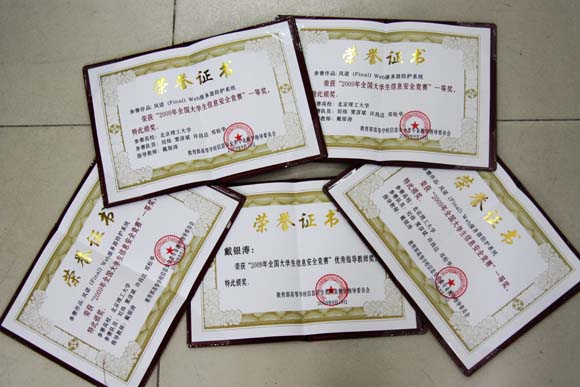“风诺”Web服务防护系统是由软件学院信息安全系戴银涛老师指导,由软件学院本科2007级的许昌达、刘炜、窦彦斌、邓松华自主开发的大学生科技创新作品。2009年全国大学生信息安全竞赛是由教育部高等学校信息安全类专业教学指导委员会主办,大赛评审专家组组长为教指委主任委员沈昌祥院士。本次大赛从报名到决赛历时5个月,参加本次比赛的共有来自全国86个高校的548支队伍。通过初赛、复赛的筛选,最终只有108支竞赛队进入决赛,决赛于2009年8月15日至8月17日在北京邮电大学举办,来自全国各大高校的108支代表队、400余名队员上演了一场智慧与创造力的较量。大赛决出了一等奖12名,二等奖24名,三等奖48名。