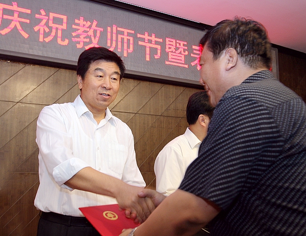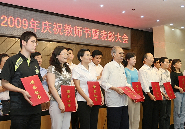 时维九月,丹枫迎秋,这是一个收获的季节,也是一个让人感念师恩的季节。9月9日下午,金年会jinnianhuicom2009年庆祝教师节暨表彰大会在图书馆一层报告厅隆重召开,热烈庆祝第25个教师节。校党委书记郭大成,校长胡海岩,校党委副书记、工会主席侯光明,校党委副书记赵平,校纪委书记杨蜀康,副校长孙逢春、杨树兴、赵显利、李和章等校领导出席了大会;T-more研究发展基金会执行理事兼首席执行官厉一凡女士应邀出席了大会。大会由校党委副书记、工会主席侯光明主持。