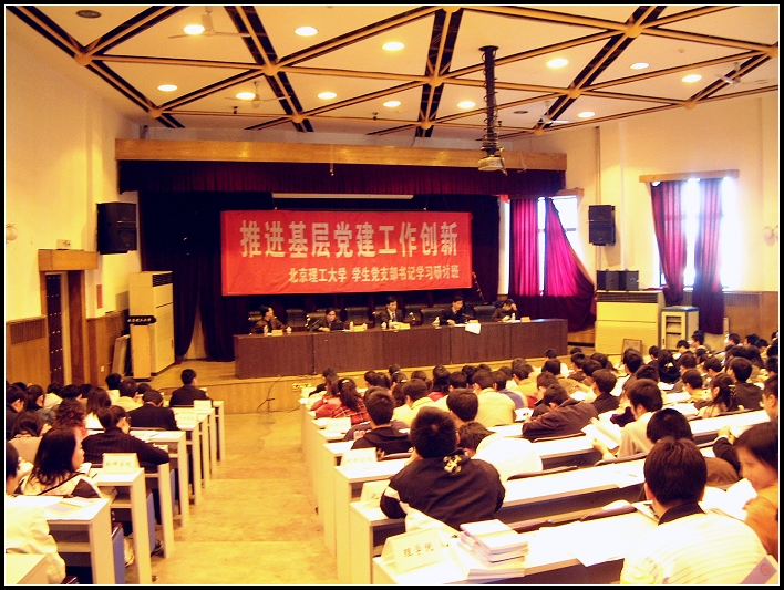 2006年10月29日下午,金年会jinnianhuicom组织部、党校、学生工作部、研究生工作部在7号教学楼一层报告厅联合组织了以“推进基层党建工作创新”为主题的学生党支部书记学习研讨班。校党委副书记、校工会主席侯光明同志、组织部、党校、学生工作部、研究生工作部负责同志、部分学院党委副书记、副院长等专职学生工作干部和300多名学生党支部书记参加了第一次集中学习培训。本次学习研讨班由学生工作部部长刘明奇主持,校党委副书记、校工会主席侯光明同志作了题为“紧扣时代脉搏 创新基层党建”的报告。组织部部长龚裕同志宣讲了《中共北京市委关于推进基层党建工作创新的意见》的主要精神并对学生党支部书记提出了积极推进基层党建工作创新的希望和要求。学生工作部部长刘明奇对培训工作做了部署和安排。本次培训时间跨度为一周,10月30日至11月5日以各分党委(党总支)为单位组织学生党支部书记开展研讨,11月5日下午将在7号教学楼一层报告厅继续组织集中学习一次。