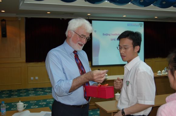 之后我校学生分会主席董立泉博士向Brian Culshaw教授赠送了纪念品,并汇报了近三年来的各项工作。Brian Culshaw教授对我们的工作给予了极大的肯定,对SPIE在中国的发展充满希望。
