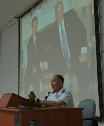 就《我国战略机遇期中的国家安全》这一报告课题,杨毅将军以战略机遇期我国所面临的挑战为重点,向学生们进行了三个方面的讲解。首先,以前段时间胡锦涛总书记访问美国一事,分析了牢牢把握中美关系的重要性;其次,以中日两国长久以来关系变化和军事力量的对比,阐述了认真应对中日关系的必要性;最后,就中国大陆与台湾在统一问题上长久以来的分歧和中美关于台湾关系的变化方面,道出了确保台海形势稳定的关键性。