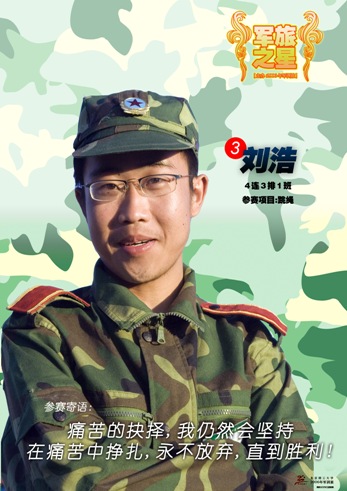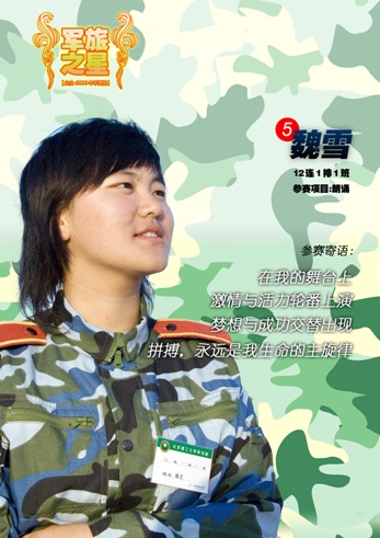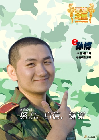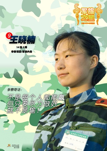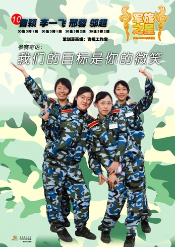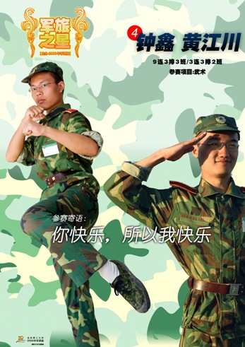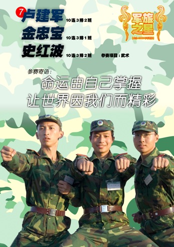 现在我们已选出十名优胜者,分别为“舞蹈之星”,“武术之星”,“书法之星”,“内务之星”,“团队之星”,“快乐之星”,“漫画之星”,“演讲之星”,“军歌之星”和“体育之星”。我们为他们制作了大幅海报,分别在学校和军营进行了宣传。校电视台的同学对比赛过程进行了录制,并制作成短片放在世纪京工网站上。