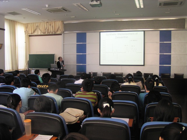 John T. Landrum教授首先向师生们介绍了佛罗里达国际大学(Florida International University,FIU)的整体情况,以及在科研教学等方面的特点和优势,其中他特别介绍了“FIU”招收留学生的相关政策,并表示作为美国东南部一所著名的研究型大学,“FIU”的上百个专业都热情地欢迎广大的中国学生前往深造。随后,John T. Landrum教授从自己的专业研究出发,为我校师生们作了主题为“眼睛中的胡萝卜素”的讲座。本次交流活动及讲座由生命学院院长邓玉林教授主持。