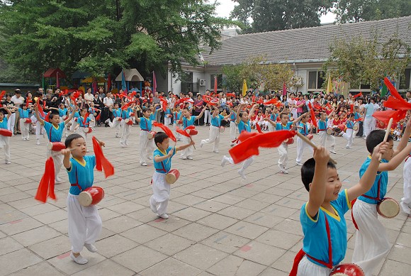 第一个节目是大班幼儿表演的“腰鼓操”,音乐响起来了,孩子们欢腾地跑入表演场地,欢庆的锣鼓洋溢着喜气,热情的舞姿在红绸的海洋里跳动,抒写孩子们喜迎奥运的快乐篇章。