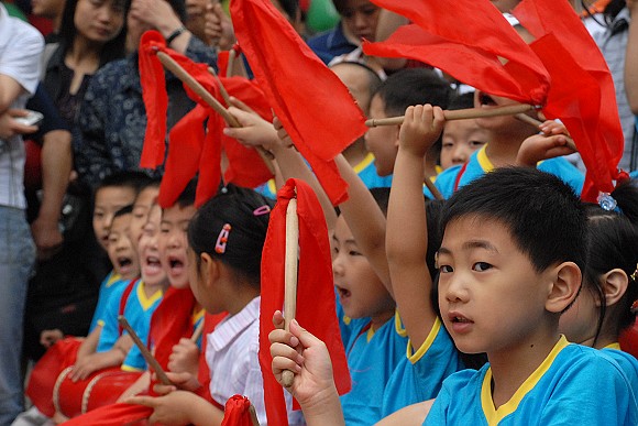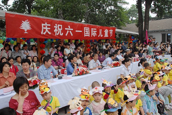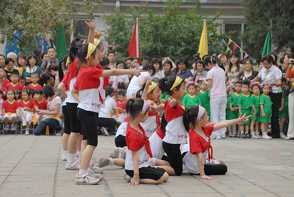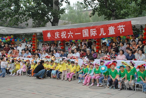 6月1日上午9:00,庆祝大会继续召开。在幼教中心操场上,庆祝会以绿色奥运为主题,孩子们用跳舞、竞技游戏的形式展示他们喜爱运动、积极健身的童真,表达他们企盼奥运的美好心愿。