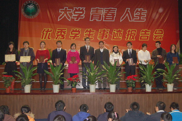 在报告会开始前,举行了简短而隆重的“领航奖学金”颁奖仪式,党委学生工作部部长刘明奇宣读了表彰决定,曾垚、李金凤、侯文龙等13名报告团成员荣获了此项殊荣。其中曾垚同学连续两年入选“大学 青春 人生”报告团,因而同时获得两笔奖学金。