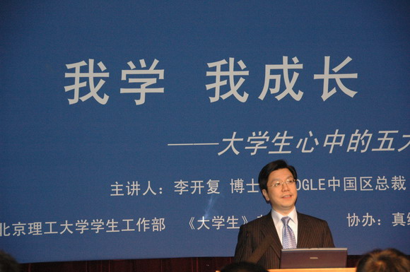2007年12月7日晚7点“聆听智慧”名家论坛第二十三期在中教报告厅举行。Google全球副总裁、中国区总裁李开复博士为北理工师生做了主题为“我学我成长——大学生心中的五个问题”的报告。