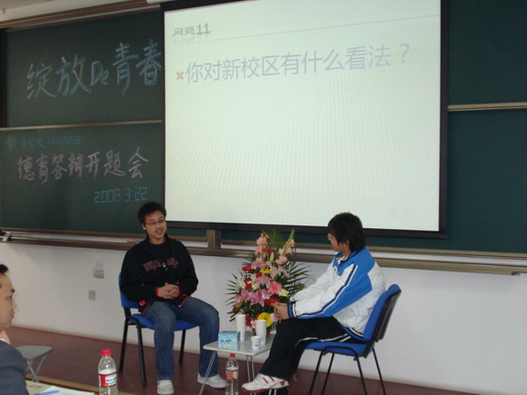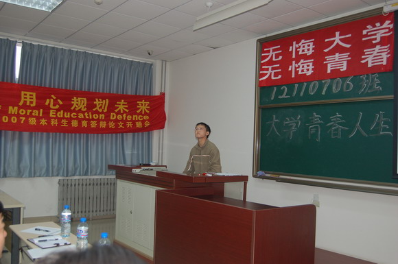 计算机学院12110706班的许成雄同学在德育答辩论文开题会上论述了思考和成长的关系。2008年4月2日晚,良乡校区举办了第104场德育答辩论文开题会,在刚刚过去的三个星期里,2007级3000余名学生相继参加了德育答辩论文开题会,与班级同学一起分享自己的思考和成长。