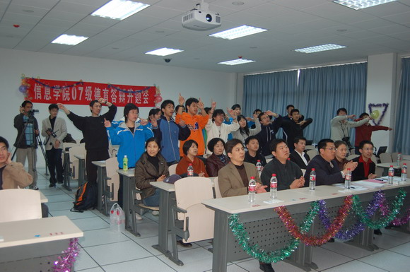 在机车学院2007级车辆一班的德育论文开题会上,戚志治同学幸运地被我校党委书记郭大成老师“抽中”成为全班第一个上台进行德育论文开题的学生,郭书记亲切的邀请这个“幸运”的蒙古族男生在讲台上合影留念。