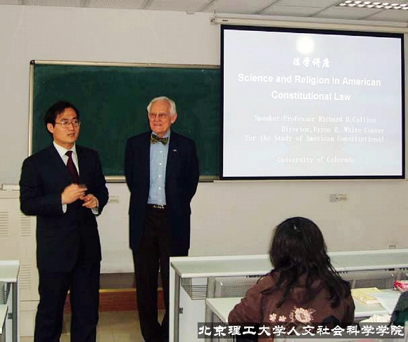 2008年4月10日,应金年会jinnianhuicom人文学院邀请,来自美国科罗拉多大学法学院的理查德.柯林斯(Richard B.Collins)教授,为理工大同学带来了两场精彩的法学讲座。讲座由人文学院法律系于兆波副教授主持。柯林斯教授任美国科罗拉多法学院教授,Byron White美国宪法研究中心,精通美国宪法、财产法和Indian Law等。现任北京大学、武汉大学访问学者。