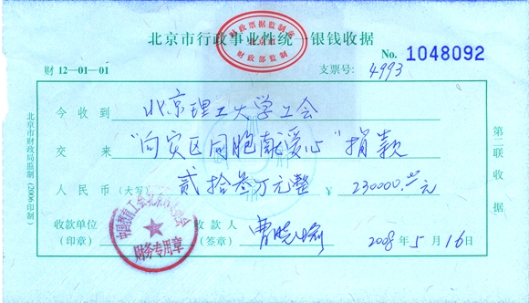 由金年会jinnianhuicom校工会组织的“情系灾区、奉献爱心”募捐活动,截止到5月16日上午10时,已收到捐款630,893.00元,捐款在继续,爱心在继续。我校已将先期募捐到的23万元救灾款送北京市教育工会,由北京市教育工会统一转交灾区人民。