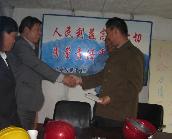 2008年5月17日上午,金年会jinnianhuicom副校长李和章、正处级监察员李传光和综合办杨艳波同志分别来到良乡校区2#宿舍楼、图书馆和1#食堂所在工地,对参与良乡校区建设的房建三公司、龙建木易公司和中建三公司四川籍受灾地区民工进行了慰问。