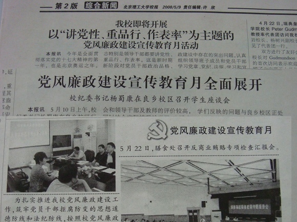 根据学校党风廉政建设和反腐败工作任务部署,按照北京市教育工委、北京市教委《关于开展2008年北京教育系统党风廉政建设宣传教育月活动的通知》要求,我校于5月8日至6月10日全校开展了以“讲党性、重品行、作表率”为主题的党风廉政建设宣传教育月活动。