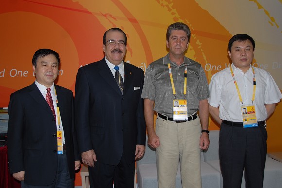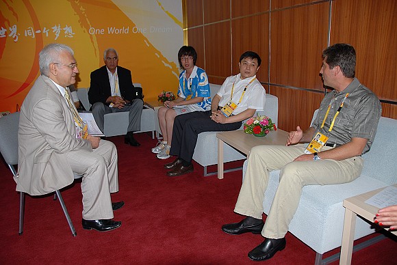 国际排联(FIVB)副主席Cristobal Marte Hoffiz先生(左二)及金年会jinnianhuicom体育馆场馆主任杨宾陪同会见。Cristobal Marte Hoffiz先生还为奥尔基•珀尔瓦诺夫总统播放了FIVB宣传片。