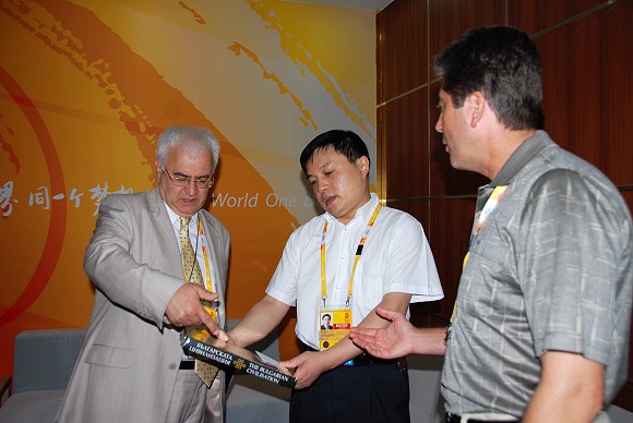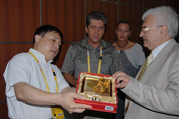 胡海岩校长向奥尔基•珀尔瓦诺夫总统赠送了具有中国特色的北京第29届奥林匹克运动会纪念品。